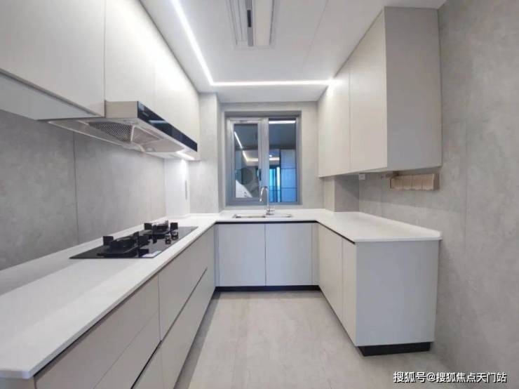 厨房U型操作台面,操作空间充裕;更值得点赞的是预留了双开门冰箱位置,你要知道普通百平米三房,基本只预留单体冰箱的空间。
