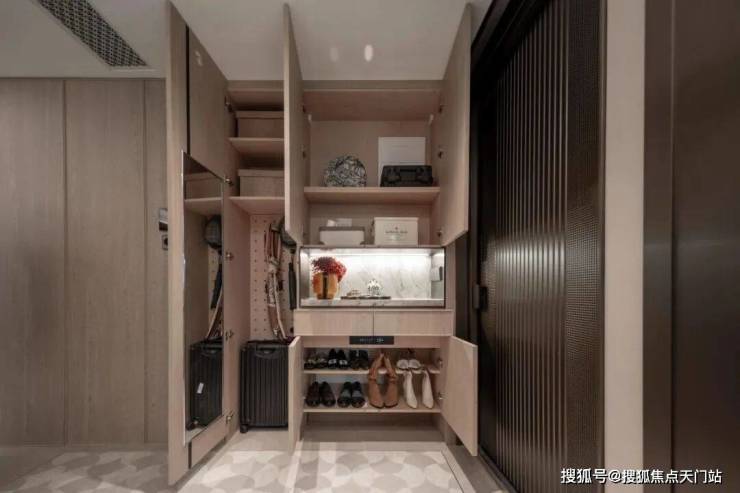 小户型最让人担心的小户型的收纳问题招商序给出了自己的解题思路,让我们看看它的收纳空间,首先是一整排的玄关收纳,玄关柜据说可以放下28双高筒靴,而且是大理石的台面石,另一侧的储物柜是一个容量较大的落地柜,足够收纳一个大行李箱,背面还贴心设置了洞洞板,可以悬挂雨伞、包包等物品,整个玄关柜是天然木皮鸡翅木包裹,非常高级,预留S墙的设计轻松收置双开门冰箱、厨房与卫生间采用了模块化的收纳系统,通过碗碟拉篮、谷物抽、不锈钢开架,贯穿式镜柜与美妆冰箱等收纳道具,将日常用品归置的仅仅有条,114主卧更是预留了超大的衣柜空间。