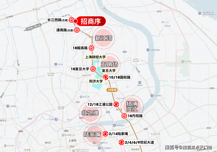 从长江西路出发(在建)出发,2站就是新江湾,4站财大,5站复旦,6站五角场,8站新华医院,11站杨浦滨江,12站陆家嘴滨江...