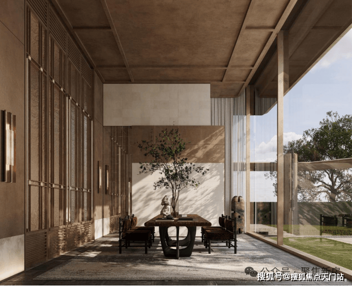 “回归之境”以3500㎡下沉水苑为核心,汇聚会客、泳池、茶室等多功能空间,形成仪式感十足的社区舞台。