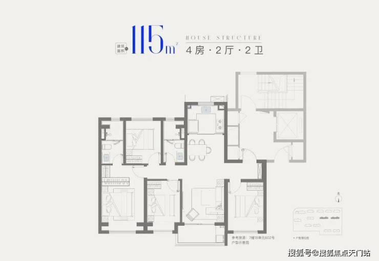 建面约115㎡4房2厅2卫,做到了四开间朝南+全卧室带飘窗+主卧套房设计,一步到位的大四房户型。兼顾大4房的功能性和空间尺度,非常难得,更适合四口之家或三代同堂家庭居住。