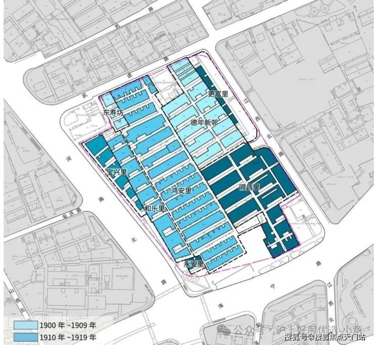 鸿安里始建的时间为1910年,属于早期石库门里弄,门头造型各异,采用半圆形,长条形砖砌门楣,部分有石箍及雀替元素;1937 年又拆建改建一批广式里弄。鸿安里是场地内贯穿南北、排数最多,体量最完整的成片里弄,富建筑型制,具有更新保护价值,被成为石库门里弄的基因库。