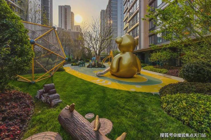 六大林系主题生活花园也是实景 ,包含中央阳光草坪与会客廊架、儿童主题活动区及四大全龄架空层等,一方面景观丰富,另一方面触发业主更多的停留和遇见的可能性,让社交在自然而然中发生。