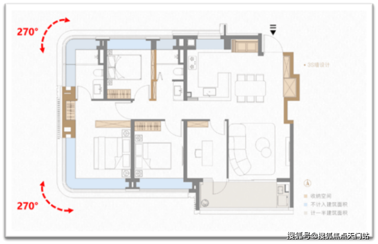 第三处山墙s墙的技术含量更高,直接让户型拥有两个大转角飘窗(主卧+主卫均双270°弧形转角飘窗)。凹处填放一个衣柜,视觉效果舒适,业主第一眼无知无觉,殊不知背后大有玄妙。