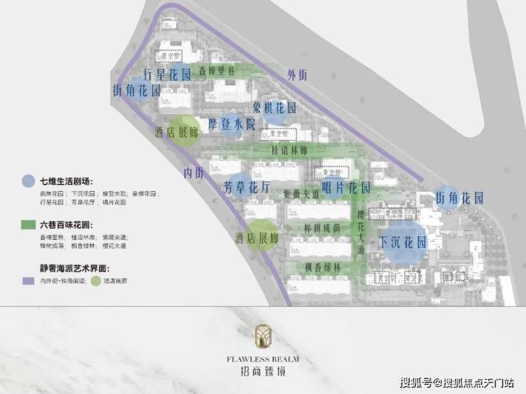 【招商臻境】精心规划了七维生活剧场,包括: 街角花园、摩登水院、下沉花园等七重生活场景,营造四季分明、美景如画的精致水岸归家之路。