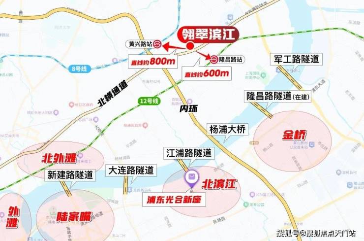 轨交方面,项目距离 12号线隆昌路站直线约600米、距离 8号线黄兴路站直线约800米,步行范围内双轨交环绕。