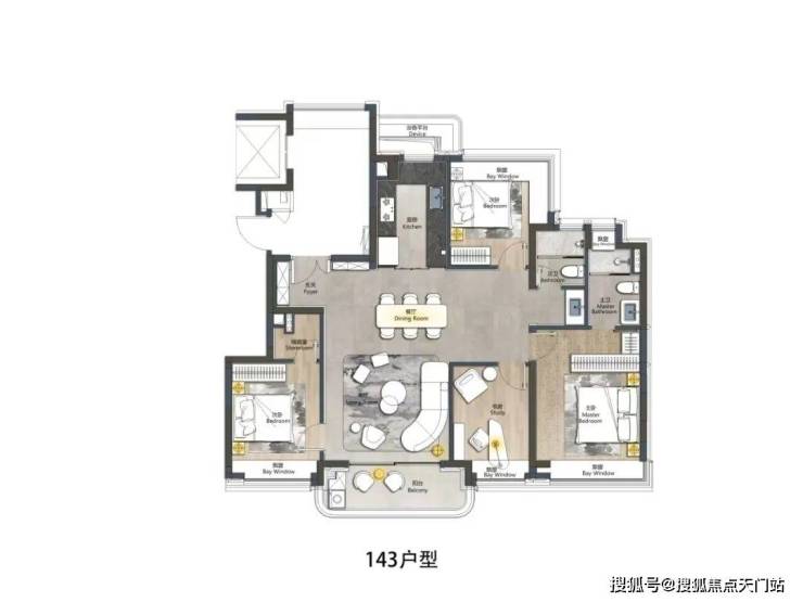 四开间朝南的设计+ 六飘窗(北次卧约270°转角飘窗) +宽面阳台,整个户型的采光通透度真的做到了完美。