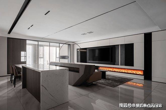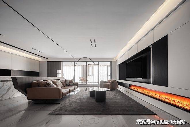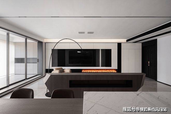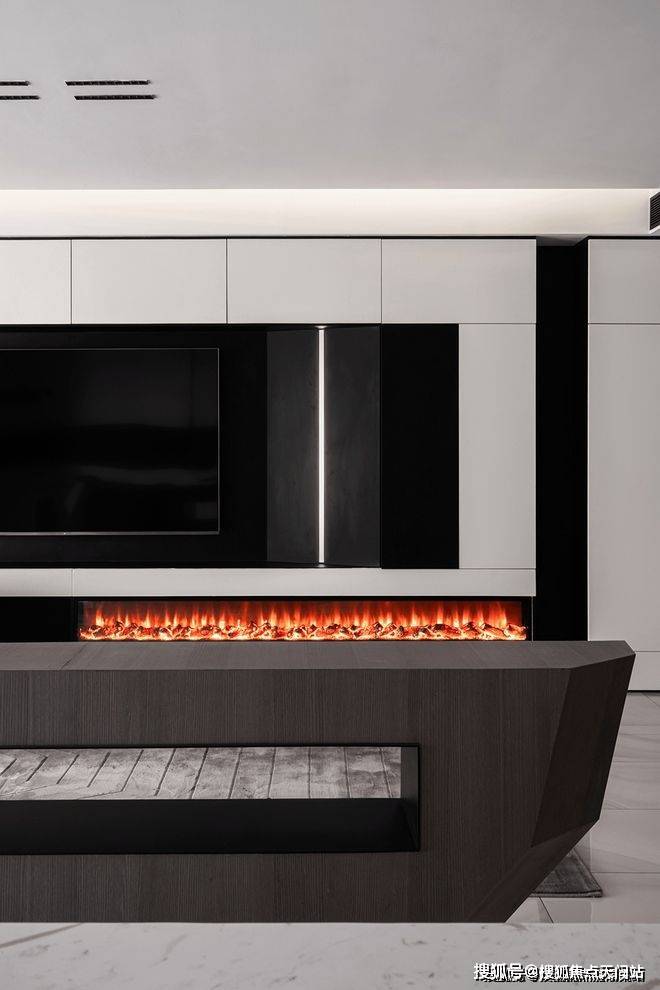黑白配色的电视背景墙将壁炉纳入这块空间,使得本身冷色调的家瞬间温暖而治愈。