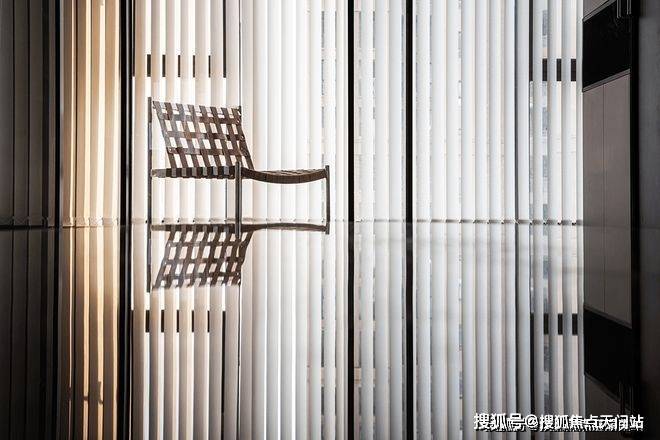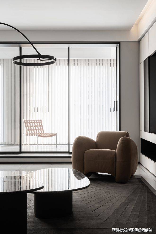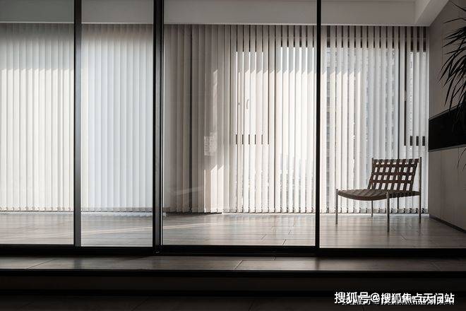 垂直百叶窗将透过大落地窗照进家中的光线均匀切开,营造出光影的效果,既保证了充足的光线又有效保证了隐私性。