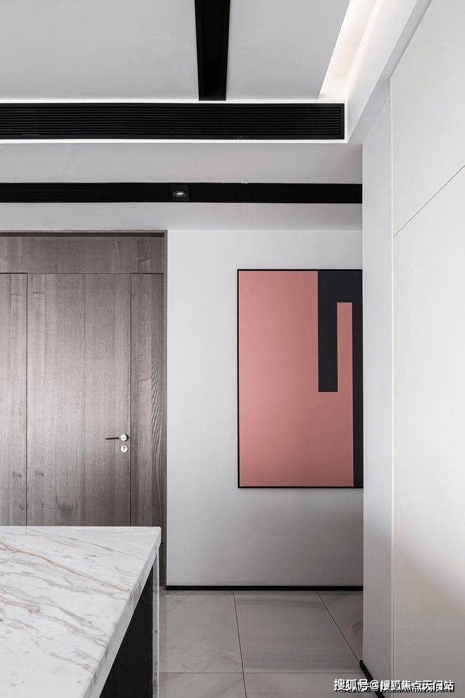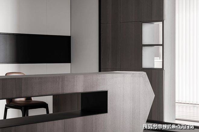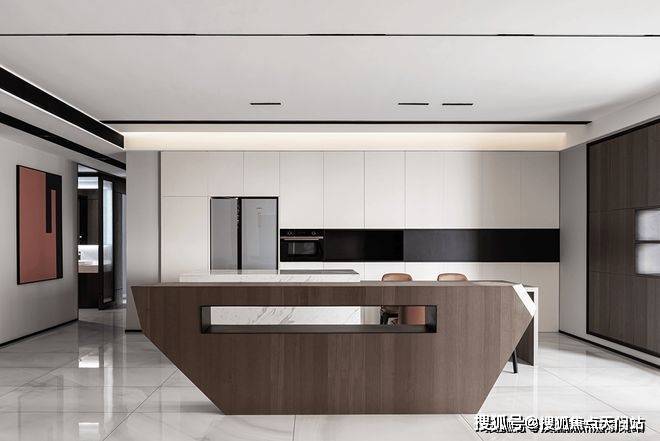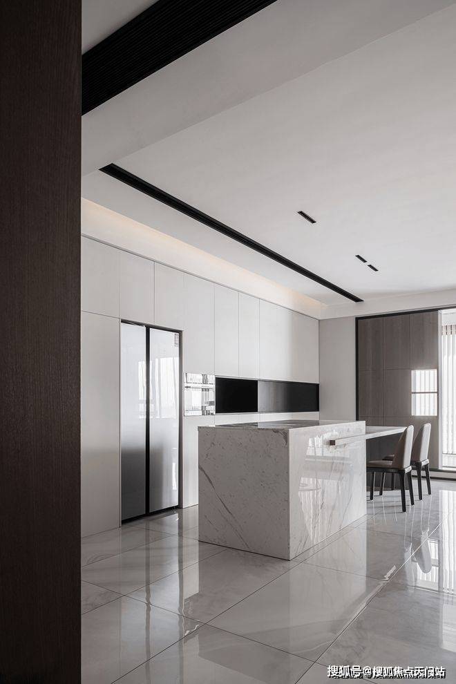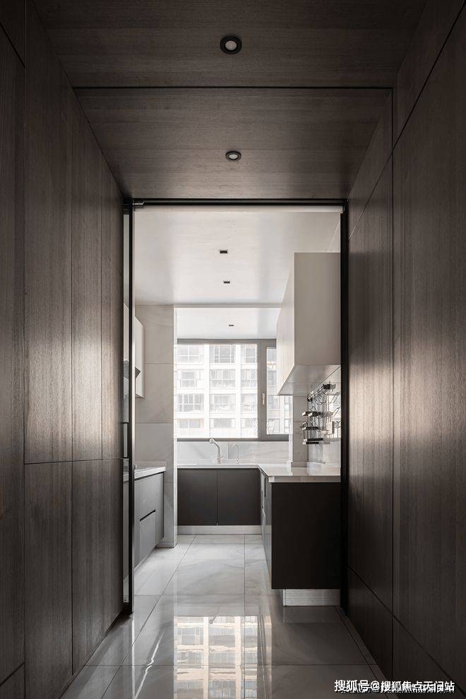 餐厅视角尽头是中厨,利用了隐藏式推拉门设计阻挡了油烟,内部整体色调依然以黑白为主。过道墙壁精心设计为收纳空间,最大限度地利用了每一块空间增强收纳功能。