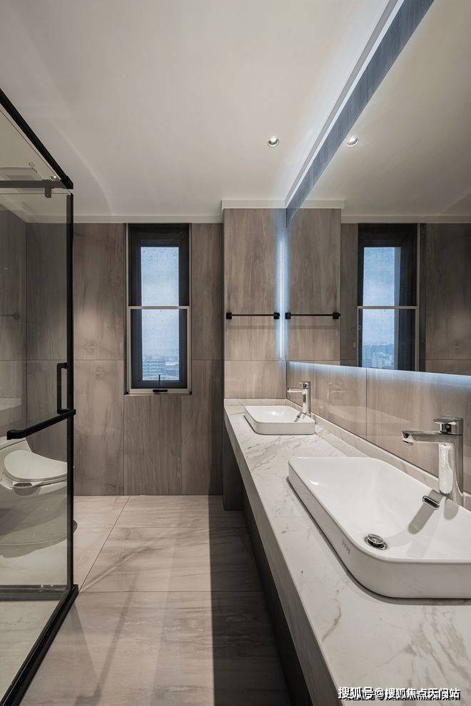 主卫因为空间足够大所以做了双台盆设计,有效提高生活效率。灯光细节设计为空间增色不少,整面镜搭配背光增加氛围感,搭配灰色系墙地砖,干净大气好打理。