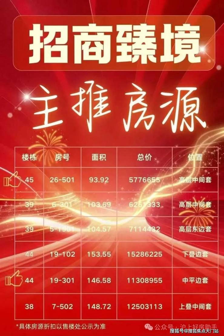 最新消息:【招商臻境】三期加推建面约95-150㎡高层&叠墅,首开124套房源,其中95㎡高层3房102套全开,总价约530万左右,148-150㎡叠墅22套,上叠约1300万起,中平约1120万起,下叠约1350万起!正在认购中,前期少量建面约89-148㎡房源在售,可直接认购!另二期全新101㎡高层景观3房加推!样板间线上预约中!