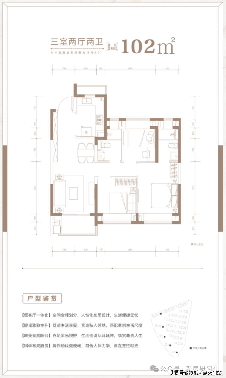 建面约102㎡3房2厅2卫户型,做到了三开间朝南+双朝南卧室带飘窗+动静分离+卫生间干湿分离,采光面拉到极致!是一个非常方正的户型。