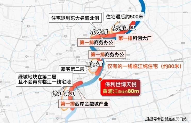 而在杨浦,临江第一排给到了科创大厂,住宅退到500米外。