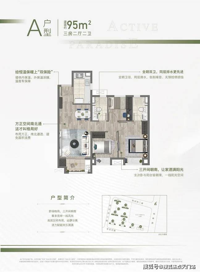 1、约95㎡的三房,南北通透,全明设计,三开间朝南,户型方正。