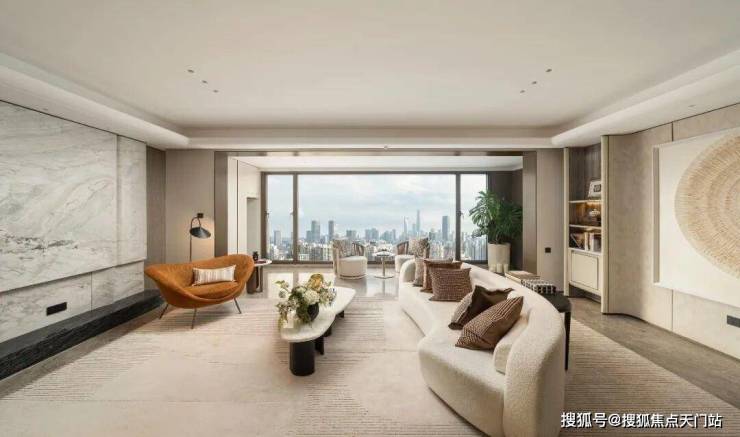 步入客厅,南向超大面宽带来豁然开朗的视野,搭配开放式厨房,LDK 一体化公区气场堪比不少180㎡以上户型。客厅与超1.8米进深阳台通铺设计,进一步延展空间感,通透大气。客厅背景墙采用弧形奢石工艺,成本不菲却质感卓绝。