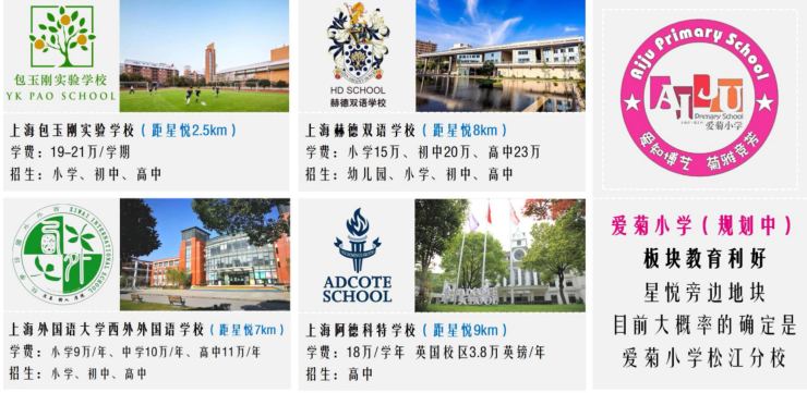 教育配套:包玉刚实验学校、上海赫德双语学校、上海西外外国语学校、阿德科特学校、爱菊小学(园区规划)、全国较大的松江大学城等;