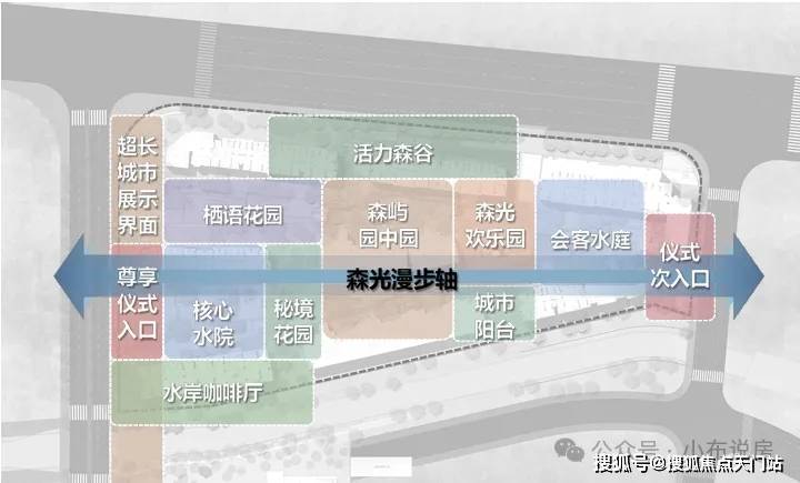 以一条尊享轴线(森光漫步轴)从东往西串联核心水院、秘境花园、森屿园中园、会客水庭。