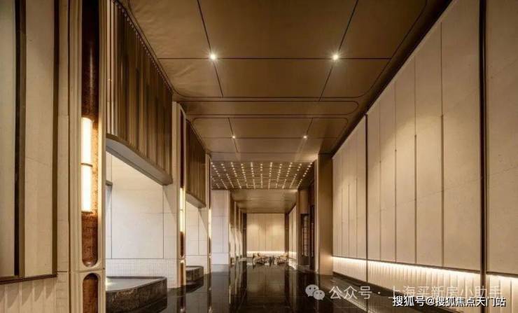 以社区北侧主入口的「鎏金」序厅为例,其设计便足以窥见公区的品质匠心:序厅总挑高约6米、总展面达30米,开阔尺度尽显气派;北向一字排开的 8根华之柱 ,采用古铜色复古肌理双曲面 铝板 打造,搭配 奢石 材质,更以 毫米级钻石切割工艺 为石材勾勒出多层次立体镶边,精致感拉满。
