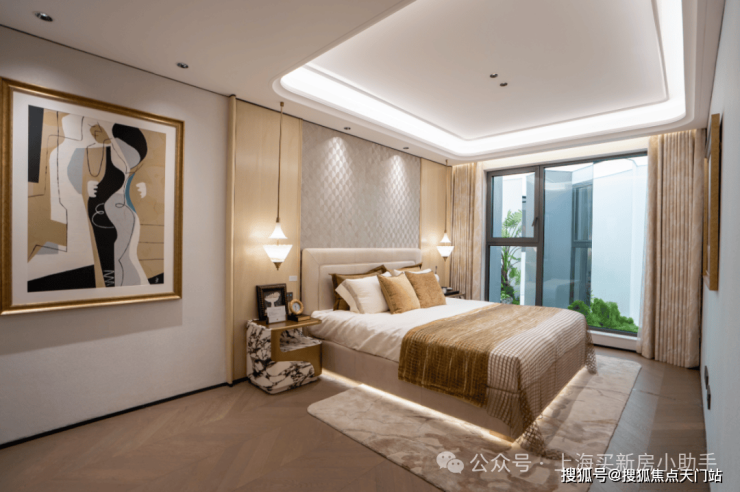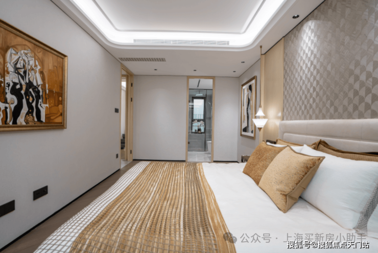 另外,像卧室地板,没有采用常规横拼、竖拼,而是采用 复杂的斜拼 ,只为更美观;吊顶设计同样暗藏匠心,采用多层次曲边造型,为空间增添优雅的线条感。