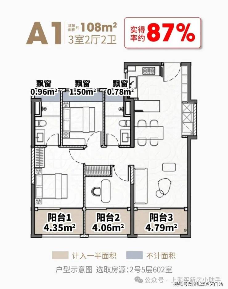 建面约108㎡3房,三阳台面积达约13㎡(赠送一半),飘窗赠送约3.3㎡,室内使用面积达约94.5㎡,实得率高达约87%,总赠送面积比常规次卧都大。