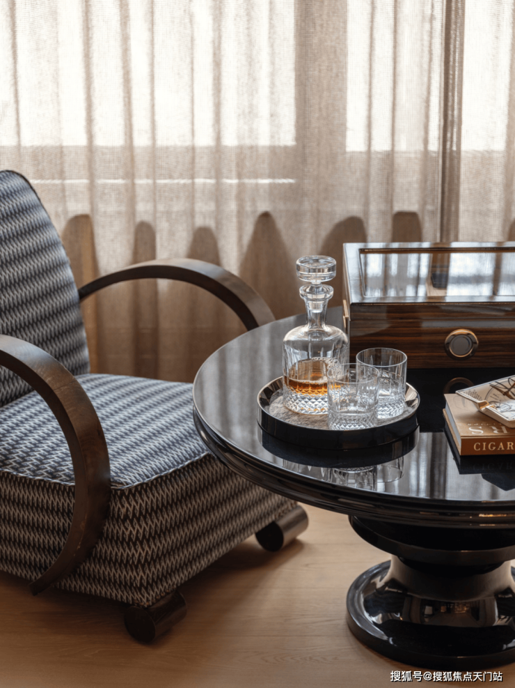 客厅另一端,是连接房内与外景的介质空间,在这里主人和客人可以享受美酒雪茄。看似独立的空间,实际延伸了客厅的功能,也延伸了窗外景观到室内的视线。