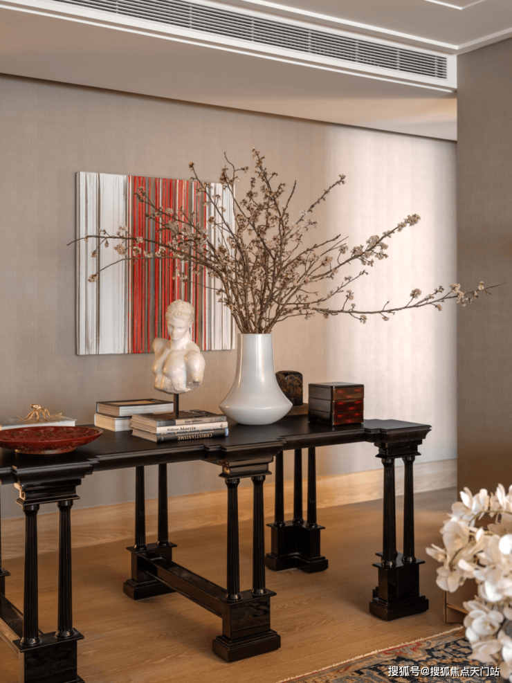 玄关是空间过渡的前站,是外部世界与私人领域之间的节奏转换地。通过材质、肌理、色调的搭配组合,构建具有电影质感的归家场景。作为空间的重要组成部分,艺术品恰如其分地妆点其中,让主人的风雅志趣一眼可见。