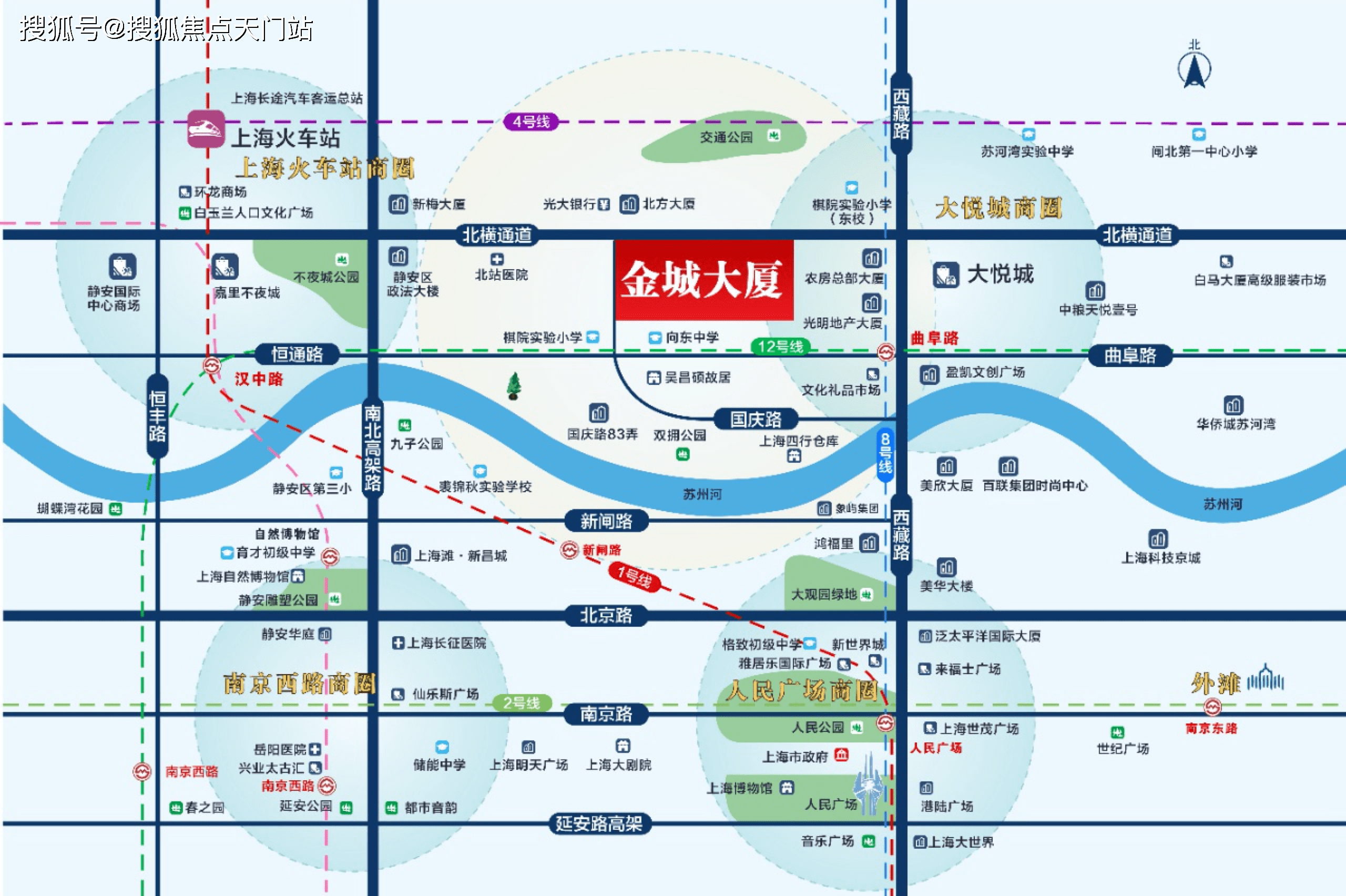 金城大厦位于静安区海宁路1399号,周边商圈环绕与南京东路商圈衔接,步行至南京路步行街1.5km,人民广场1.4km(数据来源高德地图)。静安大悦城购物中心距本项目约600米。项目毗邻苏州河,邻近西藏北路,天目中路 北横通道等多条交通主干道 地理位置优越出行便利。