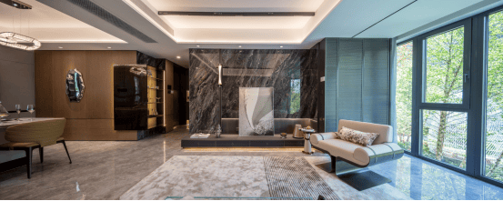 位于社区中央的第二景观会客厅聆星客厅,立面装饰有极具典藏价值的威尼斯棕奢石、吊顶采用铝板切割镶嵌、地面采用阿尔卑斯灰和福鼎黑拼花铺装。