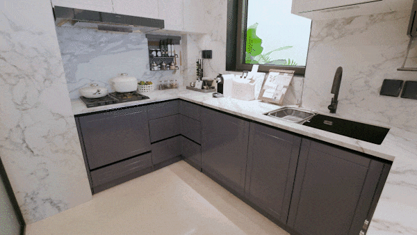 此外,通过手机APP可远程控制烤箱预热、冰箱调温及烟机动态风量调节,实现智能便捷操作。收纳系统依托博洛尼整体橱柜,利用转角空间、钻石台面及下拉式拉篮等设计,配合可按压开柜、反光镜等巧思,大幅提升空间利用率与取物便利性。厨房装修采用E0级环保板材与抗菌岩板,从源头杜绝污染,确保耐用易清洁。