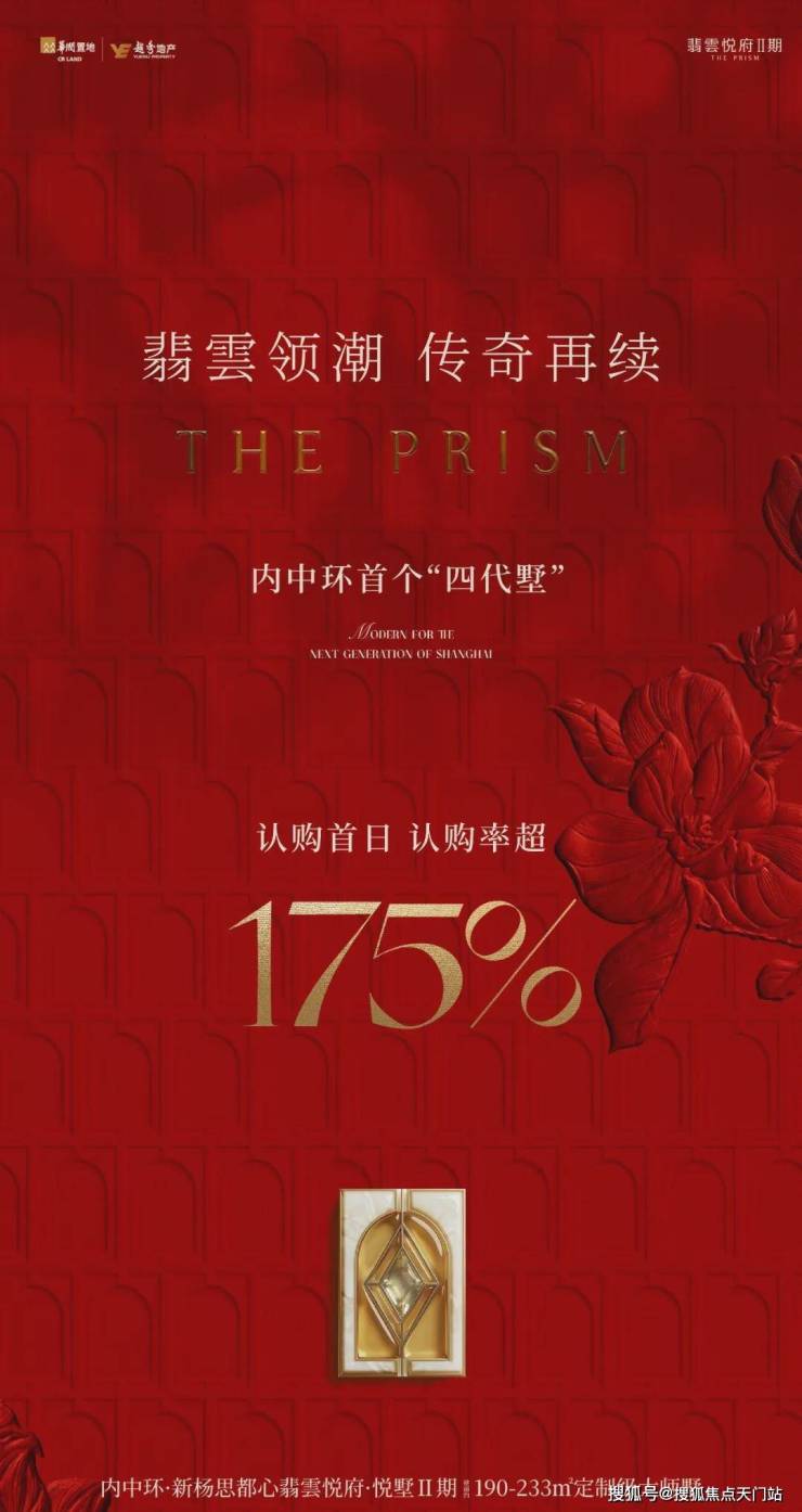 「翡雲悦府」浦东中环四代墅加推,首开认购率破175%,总价2400万起,上海首个定制化四代墅,稀缺地段,价格诚意十足。