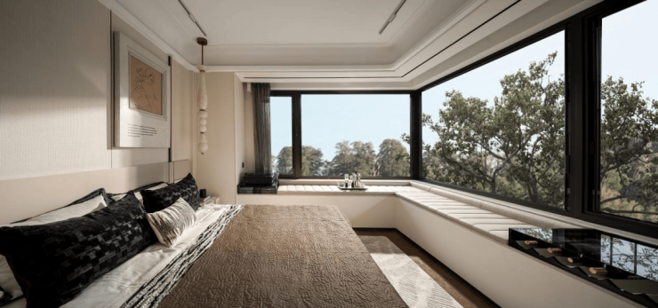 e.就连主卧也暗藏惊喜,约270° 无柱式转角飘窗搭配双面采光的卫生间,让居住更澄澈舒心。