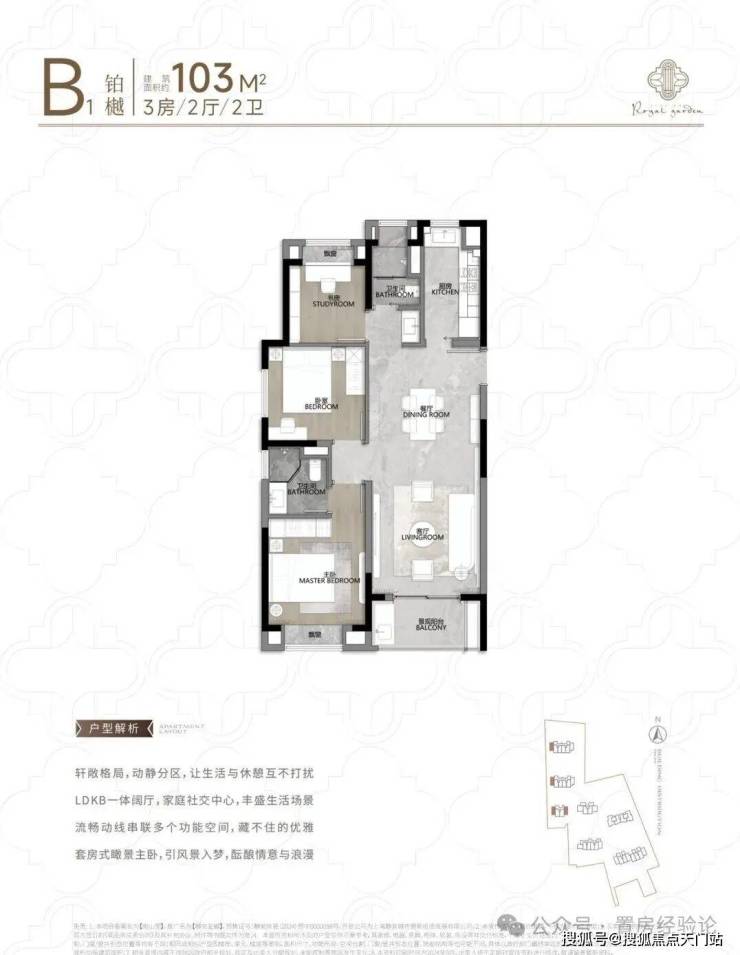 适合三口之家或年轻家庭居住的动静分区户型,厨房、餐厅、客厅及阳台一体化设计,动静完全分区设计,相当人性化!主卧套房设计满满尊崇感;次卫三分离干湿分区设计,考量十分贴心!