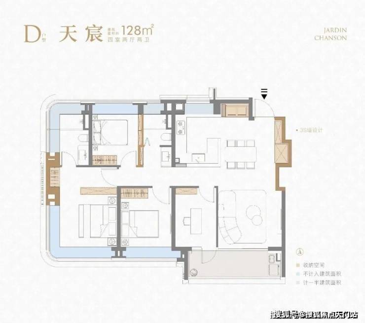 项目建面约128㎡4房户型 延续了前作3S墙的设计,保证了收纳空间的丰富性。