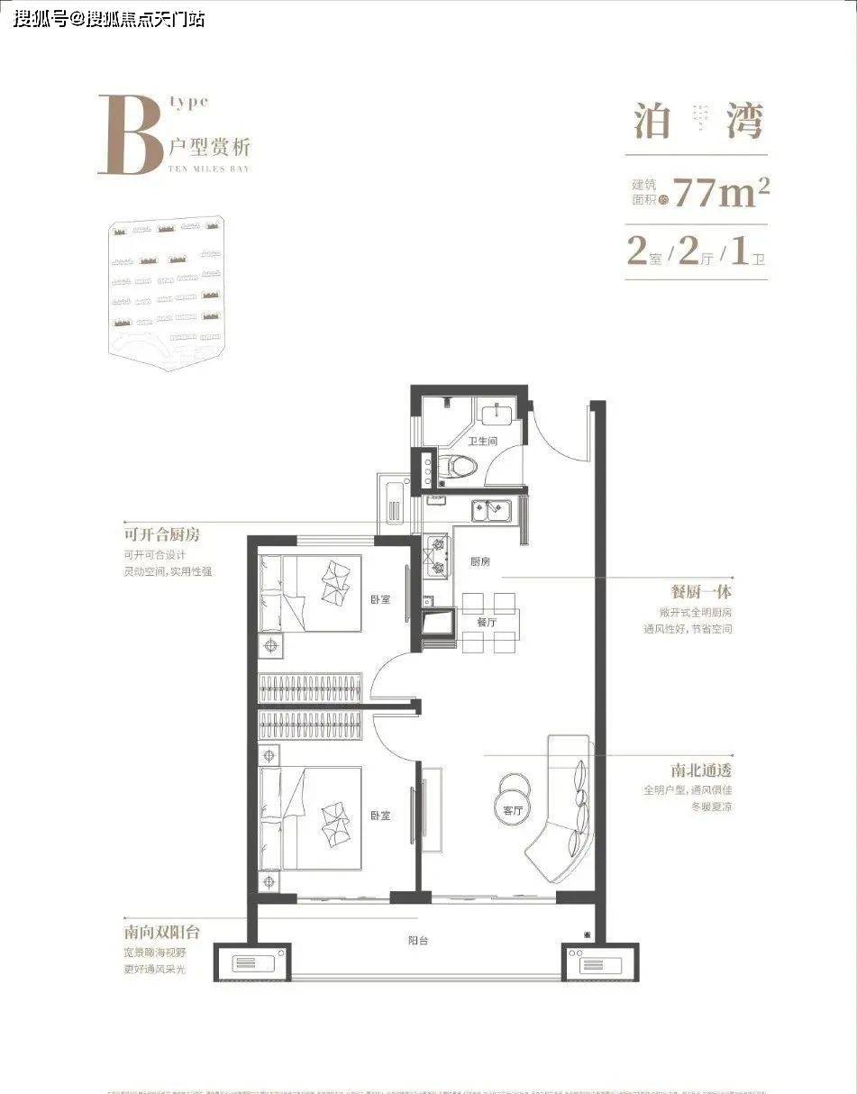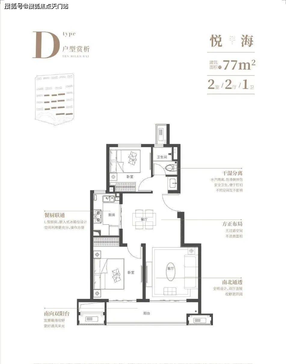 【高层77平】6.7m大面宽双阳台,180o东西向全境观海,户型方正,南北通透!