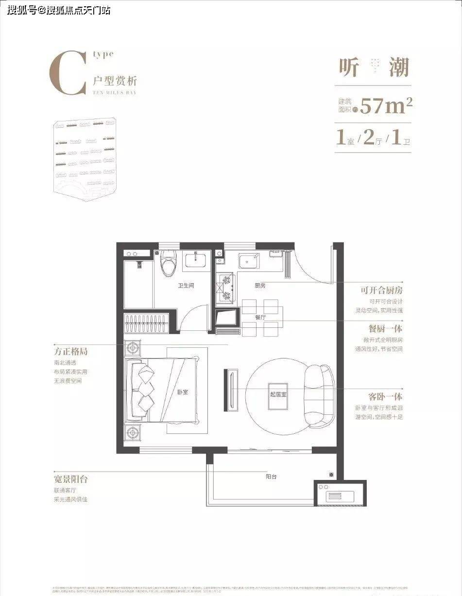 招商碧桂园十里海湾在售住宅区域为柏悦湾,首次开盘区域在售建面50-110㎡,户型以一室和两室为主。