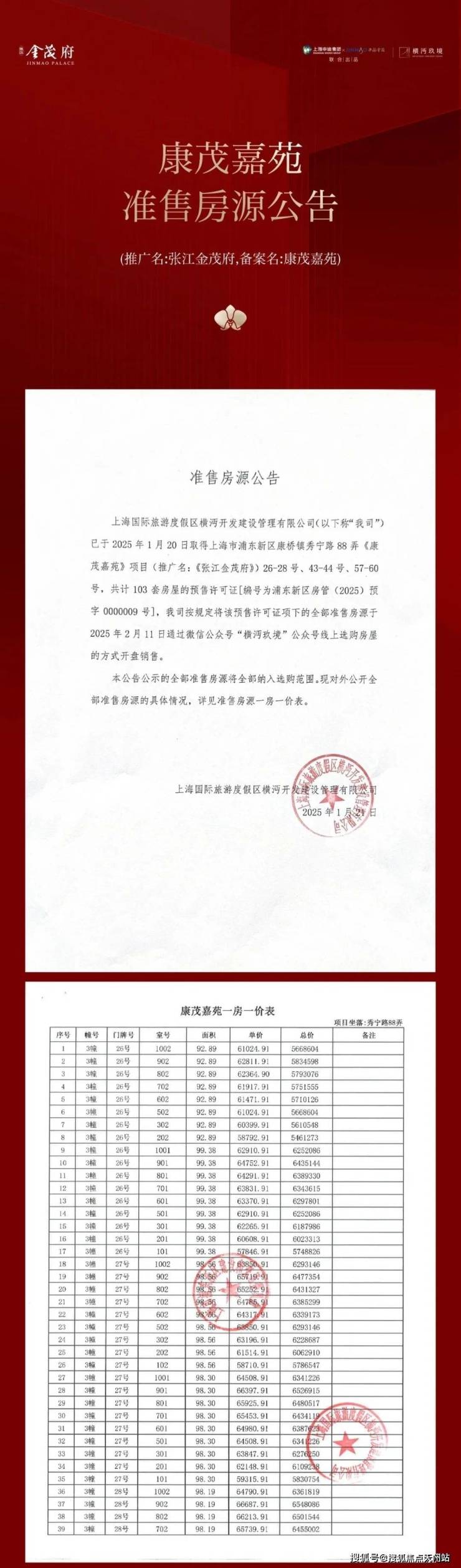 张江核芯现象级红盘张江金茂府四批次认购中,主力建面约93-138㎡科技洋房,建面约188-216㎡科技叠墅,过会均价约70310元/㎡ 末尾附一房一价表