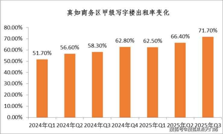 真如的产业规模十分扎实。公开数据显示,2024年,中海中心跃居上海写字楼年度租赁市场成交榜首。真如商务区甲级写字楼出租率也一路攀升——从2024年一季度的51.7%,提升至2025年三季度的71.7%。