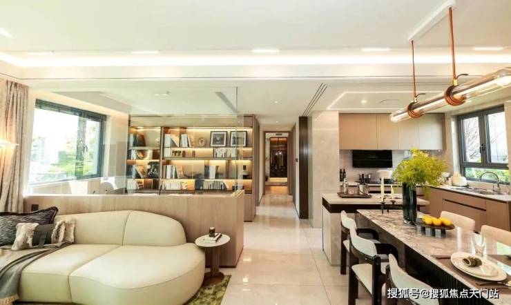 在保利·海上瑧悦的128㎡户型设计中,X空间的功能由业主定义,可以是书房,也可以是mini健身房、练习的琴房。原本全封闭式、独立一隅的静谧空间,也可以打破墙体的限制,成为开放式天地,与厨房、餐厅、客厅三大功能空间无界联通,诞生宽敞奢阔的家庭社交生活聚场,形成灵动自如的洄游式生活动线。