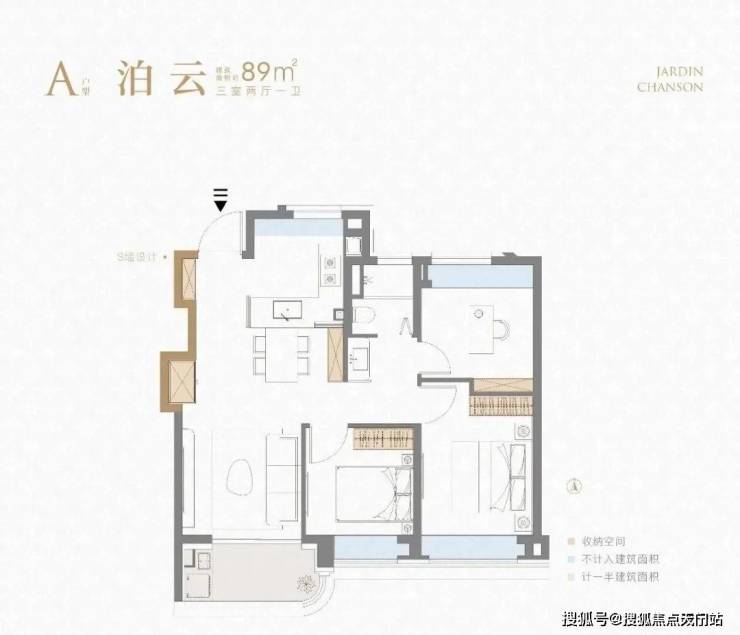 这个建面约89㎡户型妥妥的性价比之选, 不到90㎡的建面实现3房一步到位,功能性上符合市场需求。