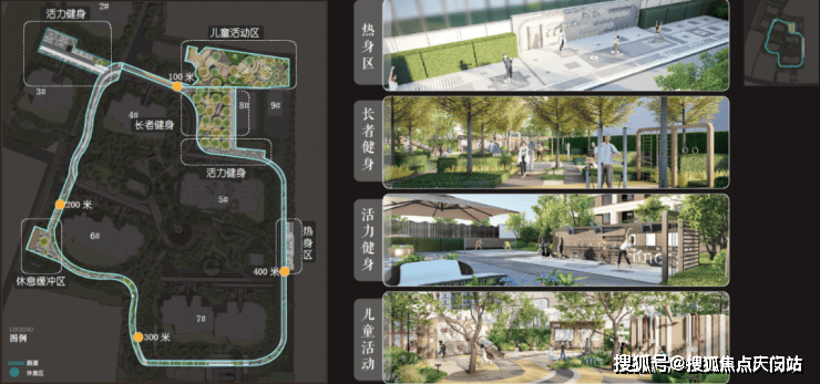 精心设计的环绕社区的400m跑道系统串联热身区、定制主题儿童活动区、老年健身区、活力健身区和休憩缓冲区五大运动活力系统,家人在社区内锻炼身体的祥和画面呼之欲出。