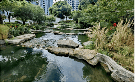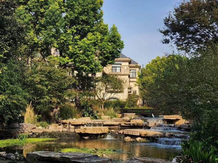 项目社区采用五重景观层层叠进,真石假山造景,承延墅区臻贵肌理的雅趣园林,引入自然河流,打造三面环水的滨水谧境,无界相融生态绿境,将社区、建筑、河流串联的相映成趣,自然围合,移步景异,营造极具魅力的惬意日常。