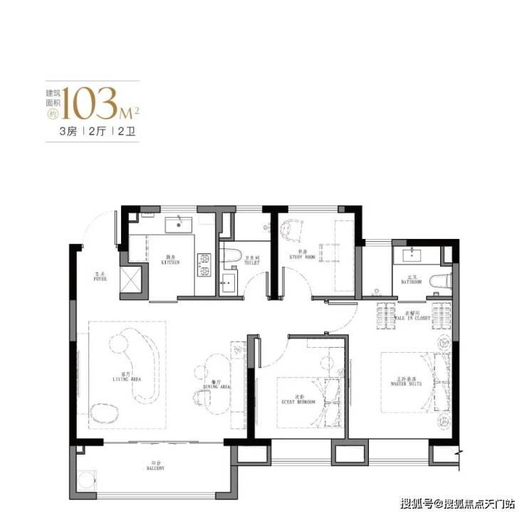 产品:103㎡、107㎡的三房两厅两卫及123㎡、129㎡的四房两厅两卫