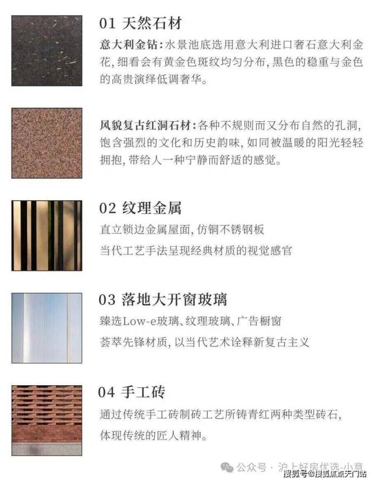 项目采用天然石材和现代工艺相结合的手法,水景池底则选用意大利进口奢石金钻,大门选用风貌复古红洞石材。