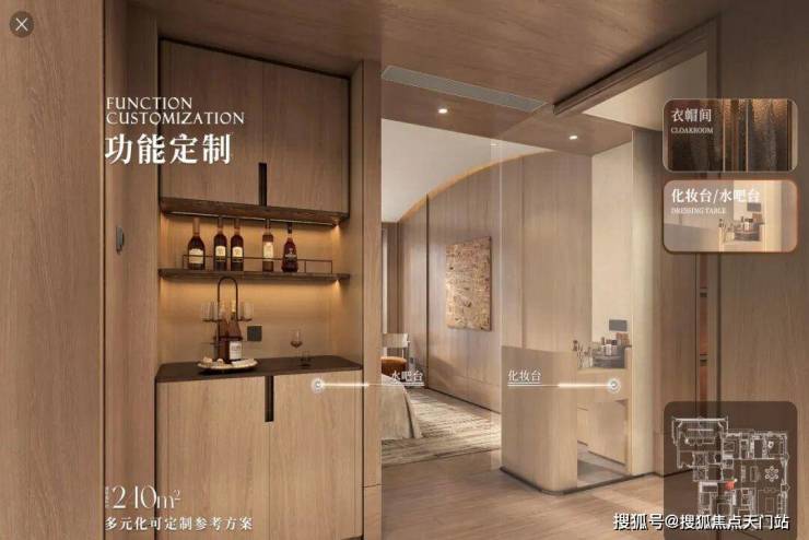 甚至还有功能定制,以240㎡主卧衣帽间为例,提供整体收纳、化妆台、水吧台等多种布局,精准贴合个人生活习惯。