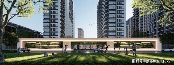 穿过公园进入社区前场,仪式感铺面,类高奢酒店设计,约10米高的「精神之门」矗立。