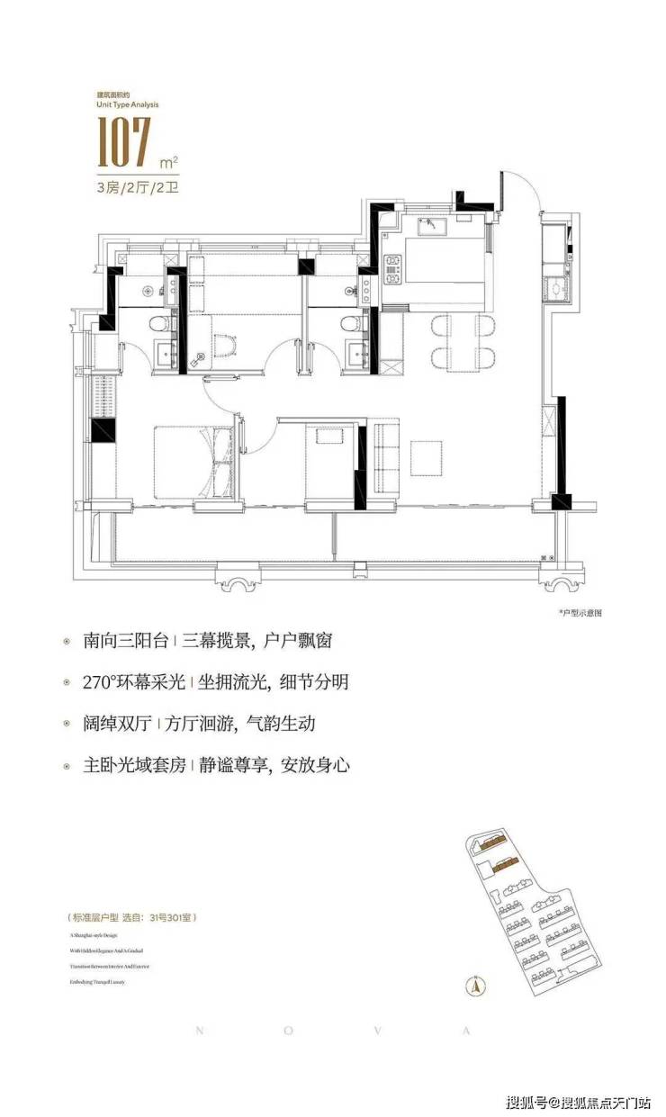107平3房2卫,开发商号称实得率接近100%,做出了这个面积段罕见的5米面宽、9米纵深的客餐厅。