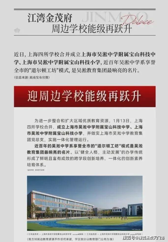 4、优质教育集群,是价值最深厚的“压舱石”当板块内的教育资源通过战略合并与整合实现能级跃升,其带来的不仅是教育选择的优化,更是区域价值的深层加固。优质学校的聚集,始终是资产穿越周期最坚实的保障,为社区提供着持续而稳定的内生动力。上海四所学校合并成上海市吴淞中学附属宝山科技中学、上海市吴淞中学附属宝山科技小学两所重点学校,这将为江湾金茂府的未来价值提供重要支撑。