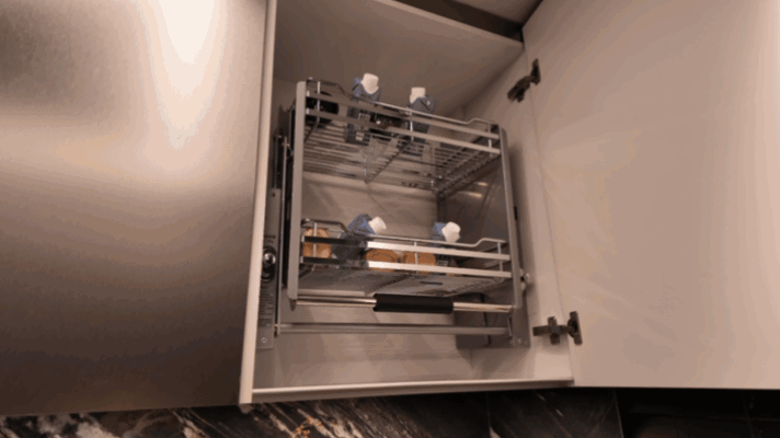 在厨房窗户旁的吊柜中,一般这种角落位置取东西不太方便,因此此处做了一个下拉篮。