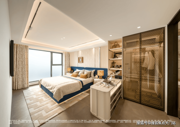 108户型主卧,连通阳台后,整体空间感媲美130㎡大三房的主卧尺度, 在放置1.8米大床+双床头柜后,还能定制一个大尺寸L型衣柜 。